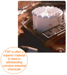 With an unparalleled understanding of FRP corrosion processes, RGE can design FRP to resist a wide variety of industrial chemicals including acids, alkalis, sodium hypochlorite and many organic solvents. FRP is a well defined, engineered structural material offering excellent chemical resistance, often in environments unsuitable for steel and concrete, and high strength to weight ratio. Common chemicals stored and transported in FRP include sulphuric acid, hydrochloric acid, sodium hypochlorite, sodium hydroxide, salt solutions (plus hundreds more) at temperatures up to 110°C in some instances. Typical equipment supplied includes: |